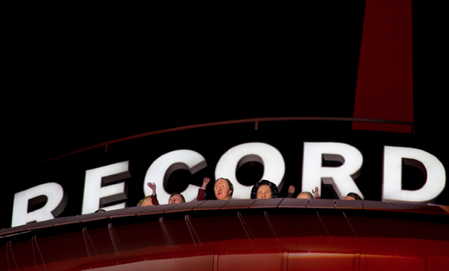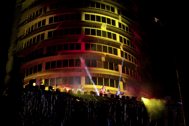 That applied in more ways than one Tuesday evening when Arcade Fire played an outdoors Hollywood show to celebrate the release of it fourth album “Reflektor.” The stage was 30 feet in the air, on the roof of an annex to the Capitol Records building, with the crowd of about 2,000 below, sardined into a parking lot across Vine Street from the Avalon. Somewhere up there, in the smoke and above the streamers and backed by the famous round tower, one of the planet’s great rock bands pulled off a nifty publicity stunt.