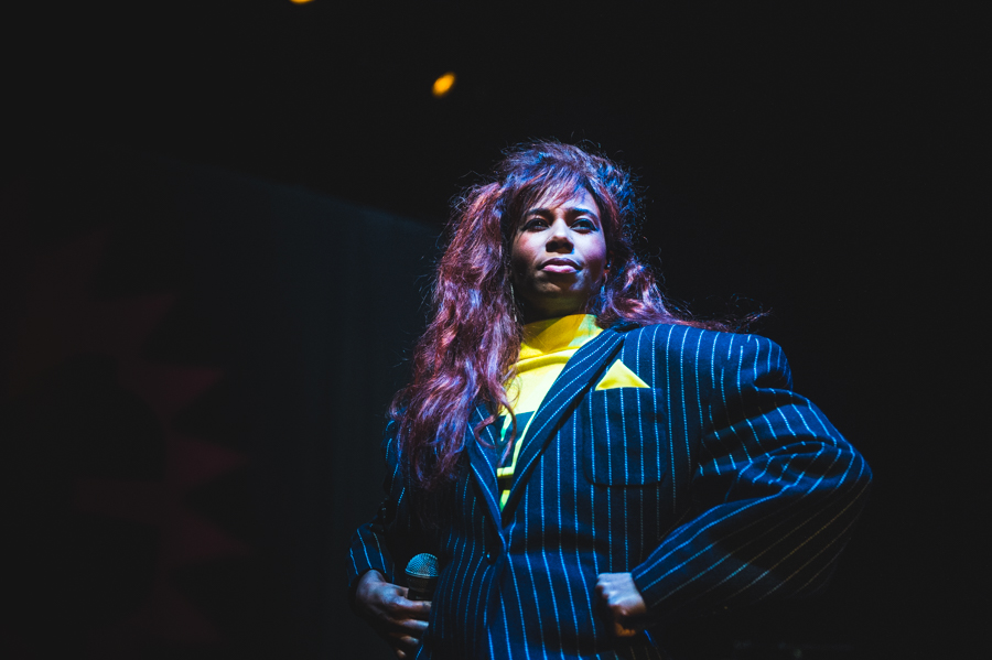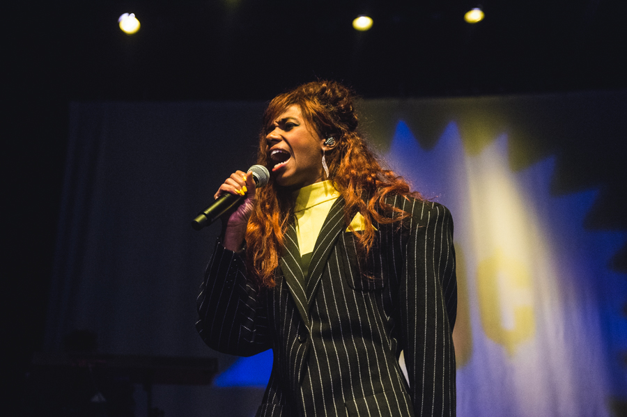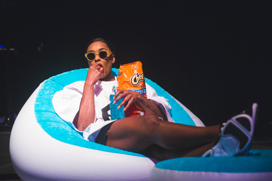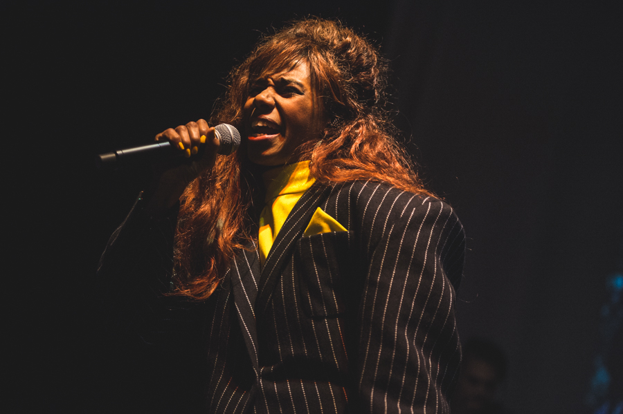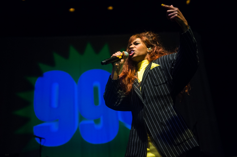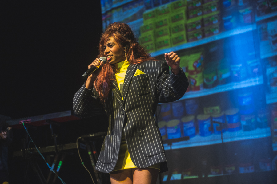 Santigold’s new album “99¢” explores themes of the commercial world, and the packaging of her show Thursday night at the Hollywood Palladium was pretty impressive, if not a bargain. Taking the stage is a large-shouldered blazer reminiscent of David Byrne, the 39-year-old singer engaged with strong vocals and a powerful visual production, including projections of PEZ dispensers and mugs bearing her face during “Can’t Get Enough of Myself.” She invited fans to join her onstage during “Creator” but warned, “No video — if you want to dance, you’re up here, if you want to take video, go out there.” Mysterious Brooklyn rapper Lekeli47 opened the show.